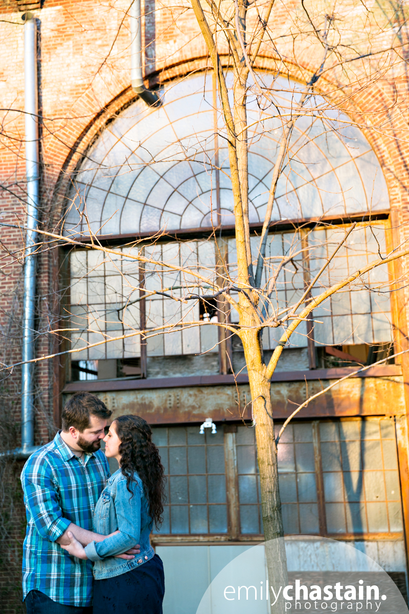 When Jenny and Mike told me they aren’t really huge Baltimore fans and wanted something a little different for their engagement photos, I thought about Station North and Clipper Mill. As it turned out, an Orioles game was flooding the downtown area with people so we decided to skip Station North and head straight to Clipper Mill instead. A good decision on our part! I’d never been there before, but inspired by my friend Dani’s recent shoot, I’d been wanting to check it out. Clipper Mill is only like a street or two, but there’s all these cool old buildings that are falling apart or that have been re-purposed, not to mention tons of awesome textures and colors. Needless to say, I’ll be back for sure. 🙂